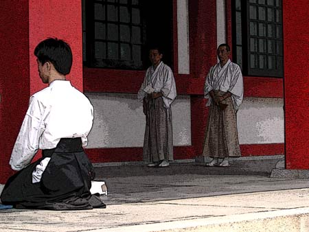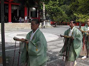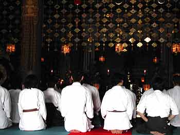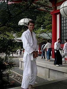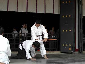 This year the festival had members of the Igo Dojo performing an Aikido demonstration on the temple steps, and I was asked by Igo Sensei to participate...and invitation which I gladly accepted. The festival gave me another chance to go up to Kurama Temple, which is beautifully situated in the hills North of the city. I have developed a certain affection for the place, not only for its beauty but also because of the experiences that I have had there. The demonstration itself was held on the front steps of the temple, which posed its own difficulties. Aikido is generally practiced on crash mats, as it involves throwing. The temple steps, however, are (predictably) made of stone.